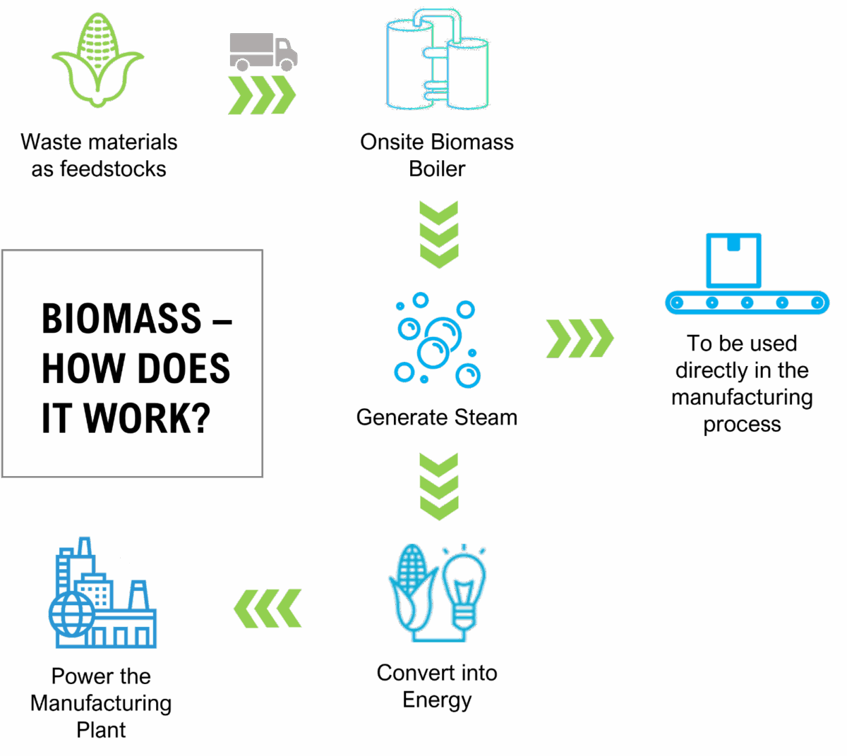 Biomass is an organic approach that is sustainably supplied. Unlike fossil fuel, raw materials will be sourced sustainably, often from byproducts of agriculture such as soy, corn and rice. These materials, called feedstock, are then converted into thermal energy such as steam or heated thermal oil through thermal processes. The heat generated can then be converted into energy and used directly onsite.