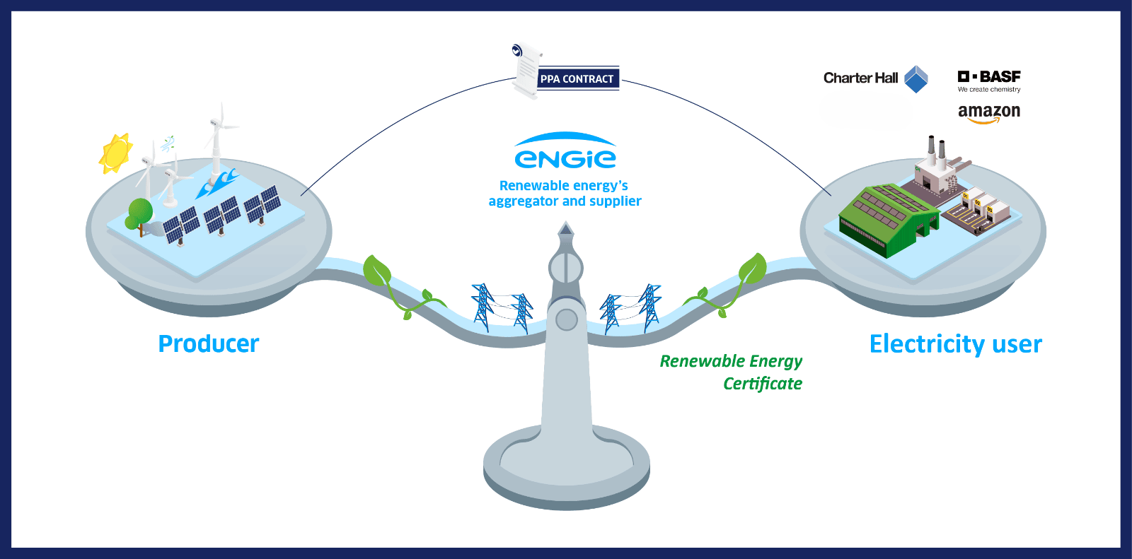 ENGIE supplies renewable electricity via onsite installations (e.g. rooftop solar) and offsite facilities (e.g. solar or wind farms) using our diverse portfolio of renewable and flexible assets. The renewable energy certificates in the Corporate PPAs can then be used to secure your renewable energy requirements according to your sustainability targets.
